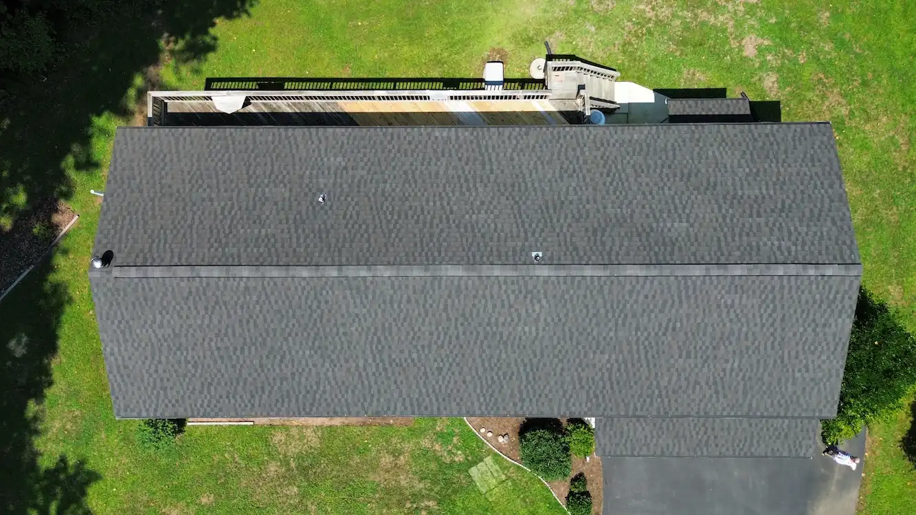 To support the roof’s long-term health and ventilation, Snow Country ridge vents were installed along the ridgelines, allowing air to circulate and reducing the buildup of heat and moisture in the attic. The team also installed white drip edge, aluminum pipe collars, and all necessary flashing to seal critical points around the roof. The system is backed by a 50-year limited lifetime material warranty and covered by a 5-year labor warranty, giving the homeowner long-term peace of mind.