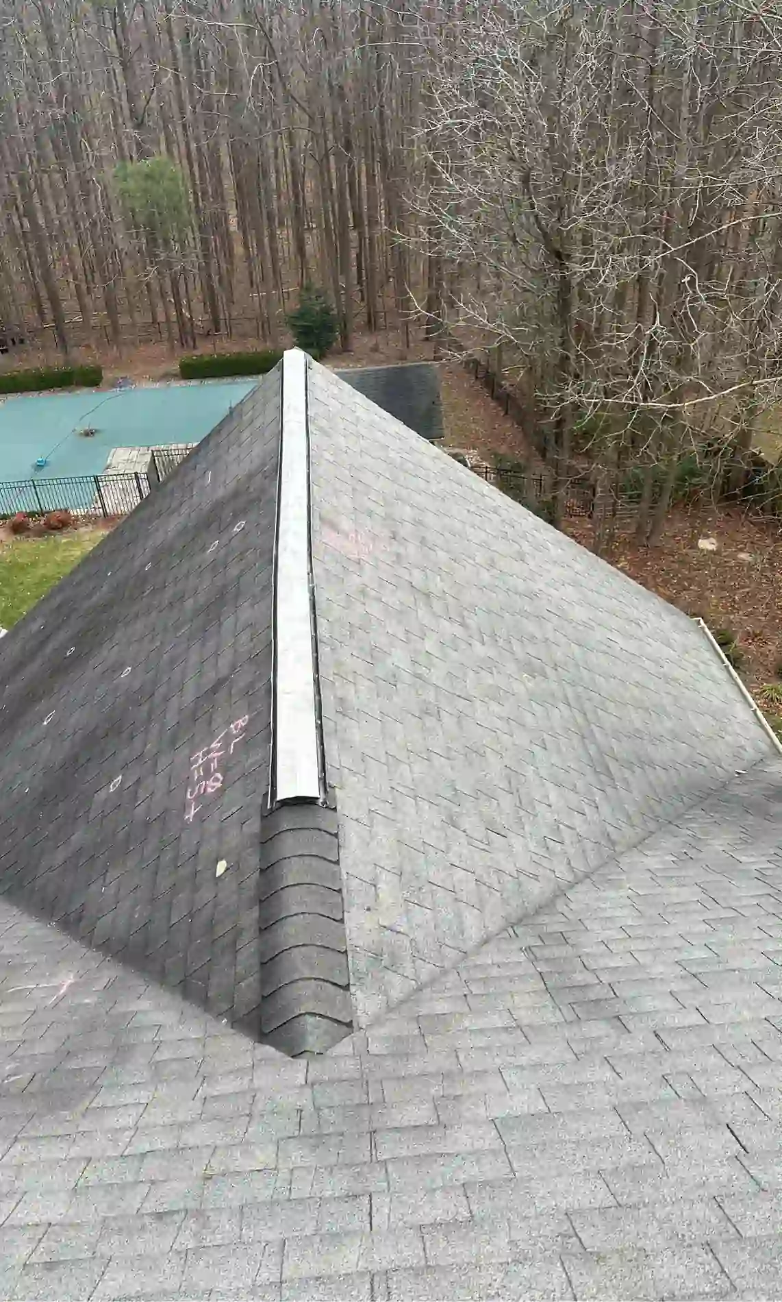 The project included removal of all existing roofing materials, thorough decking inspection, and proper installation of underlayment and flashing. A white drip edge was installed along the perimeter for clean water runoff and aesthetic edge detail. The team used a shingle-over cap-style ridge vent to provide essential attic ventilation—improving airflow and reducing heat buildup, which can help lower energy costs and extend the life of the roofing system.