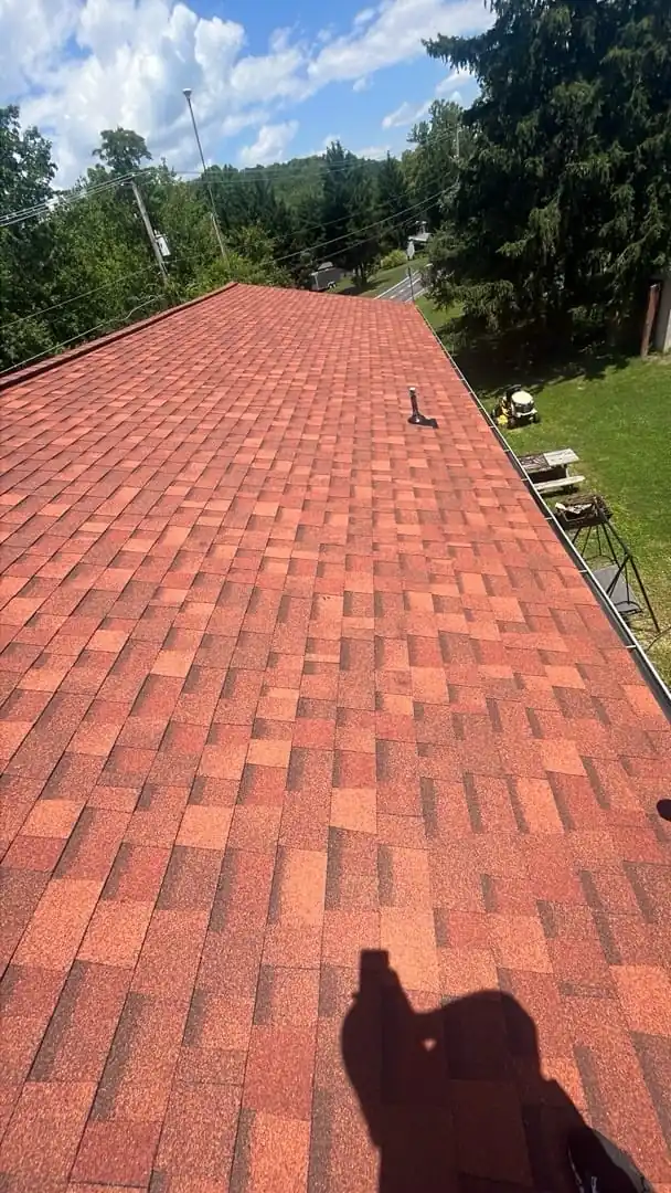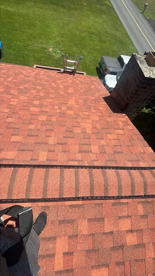 The homeowner selected Owens Corning Duration shingles in Terra Cotta, a vibrant, warm tone that adds character while offering long-lasting performance. Designed to resist wind, algae growth, and moisture intrusion, these shingles are backed by a 50-year lifetime material warranty. To enhance ventilation and protect the roof from heat and moisture damage, VentSure ridge vents were installed, ensuring steady airflow in the attic.