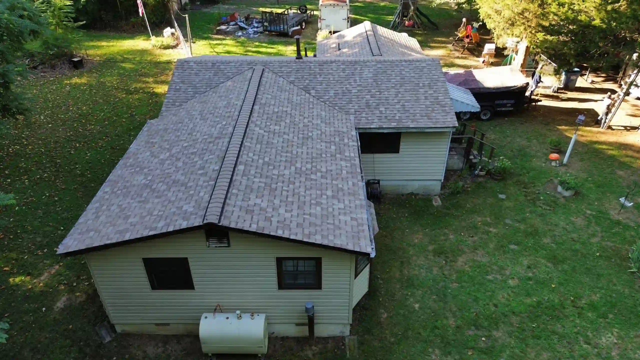 The roofing system was upgraded using Owens Corning Duration shingles in Sand Castle, a warm, neutral tone that complements the home’s surroundings while offering high-performance protection. These architectural shingles are known for their strong resistance to wind and algae and are backed by a limited lifetime material warranty. To support ventilation and preserve the longevity of the new system, DuraRidge ridge vents were installed to help manage attic airflow, reduce moisture buildup, and stabilize indoor temperatures.