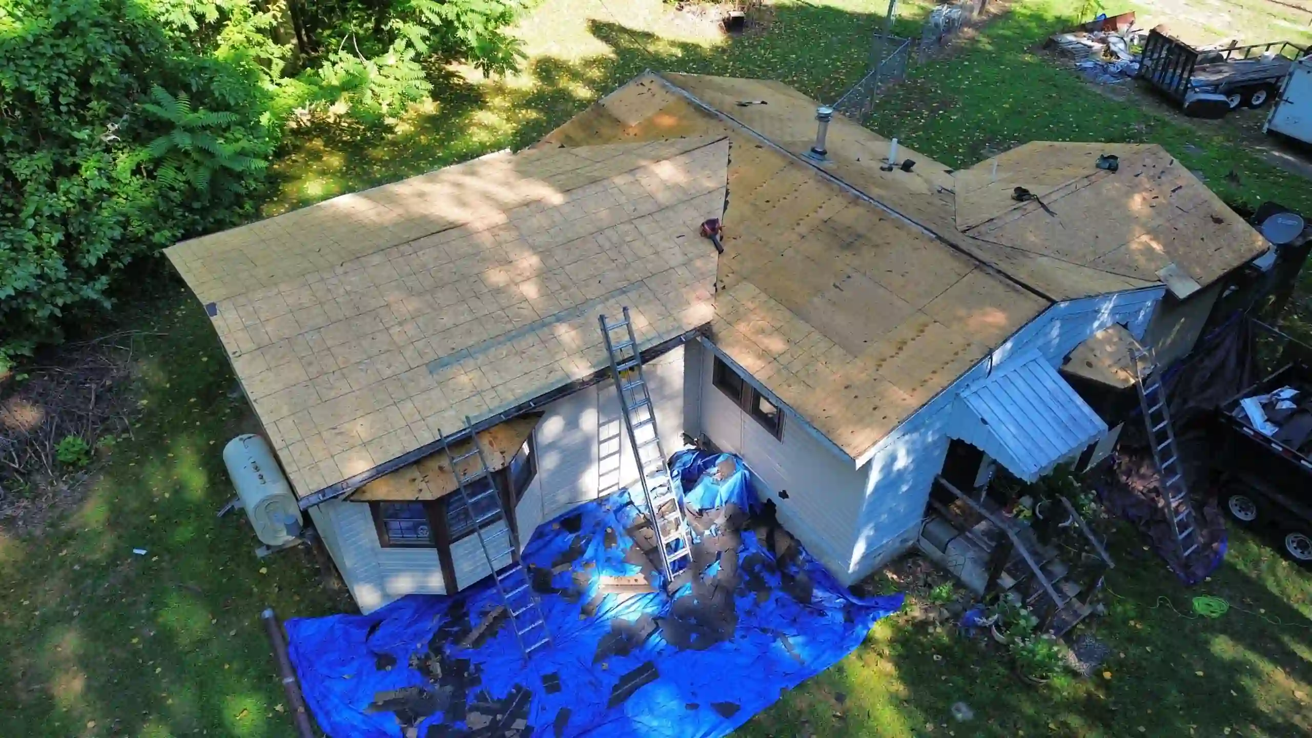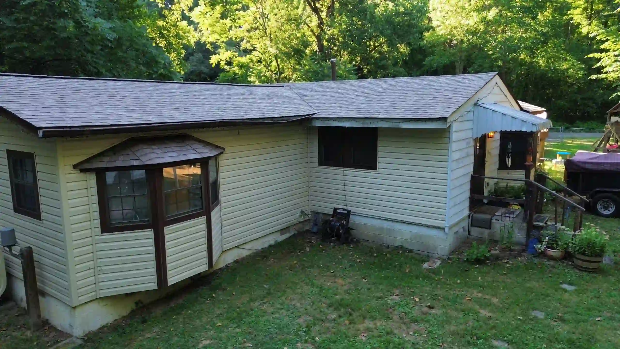 In addition to the roof replacement, several details were addressed as part of the restoration scope. Interior work included small drywall and ceiling paint repairs, while exterior tasks included the removal of an awning and the replacement of two damaged window screens. The team also reinstalled salvageable drip edge materials to complete the system and maintain continuity.