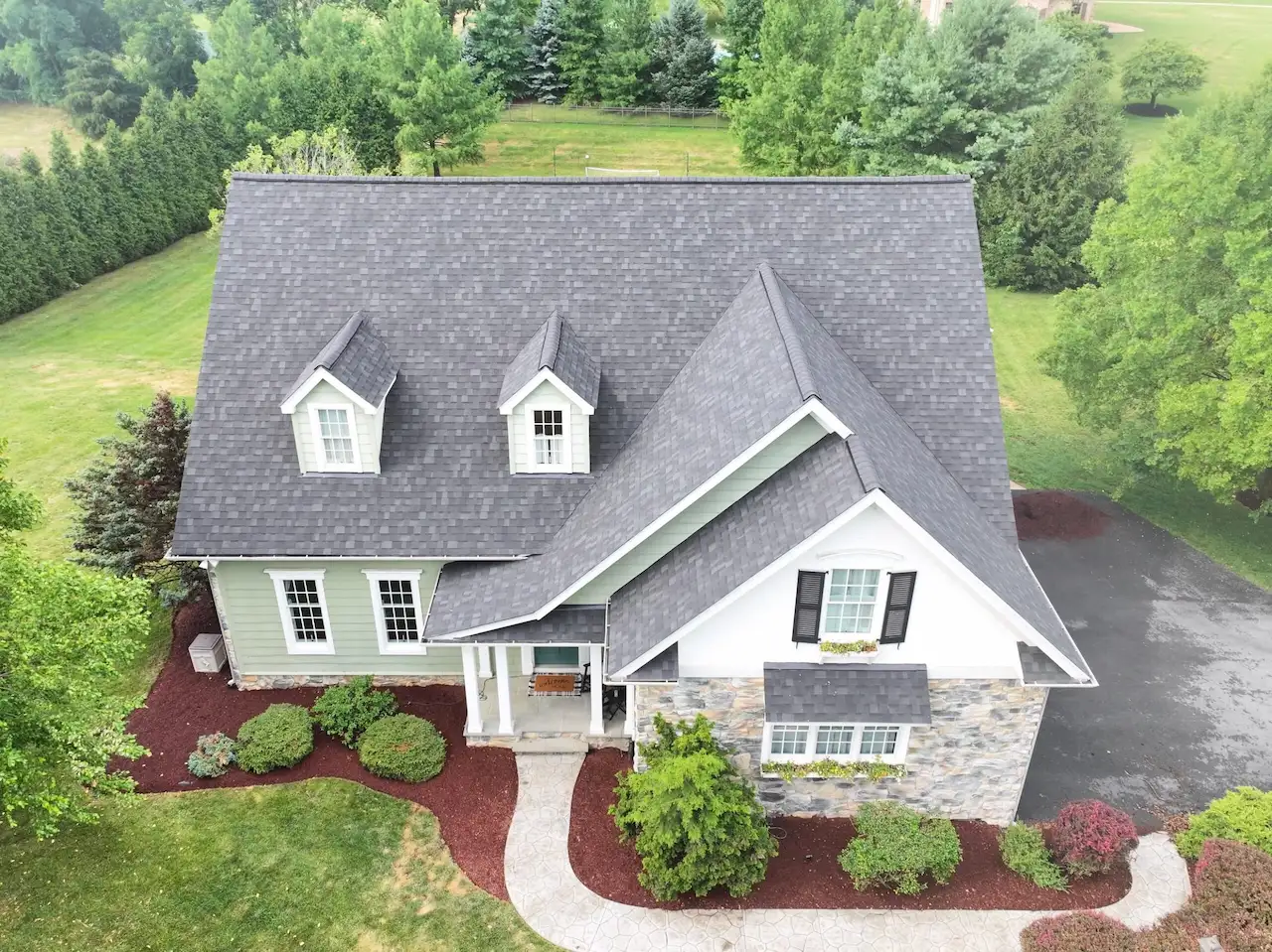 To complement the roof, 2,084 square feet of new siding were installed, giving the home a refreshed appearance and improved weather protection. The siding materials were chosen for their ability to maintain color and performance over time while reducing maintenance needs.