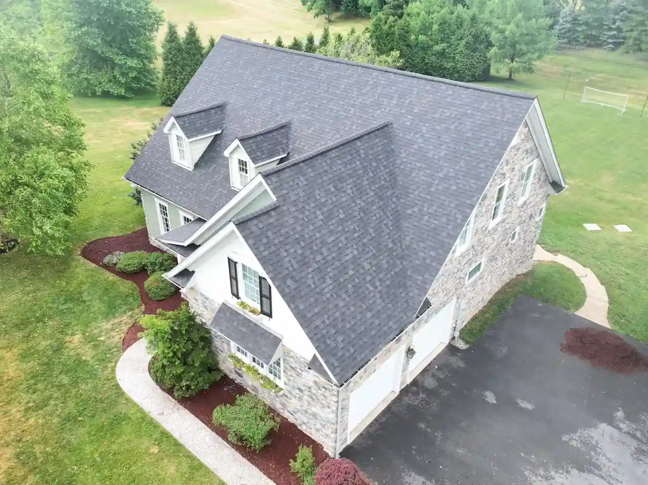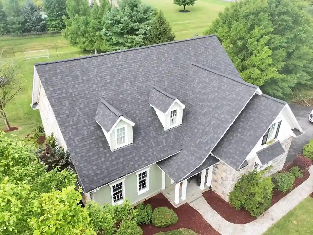 The new roofing system features Owens Corning Duration shingles in Onyx Black, a bold and timeless color that offers exceptional durability and resistance to wind, moisture, and algae. Backed by a limited lifetime material warranty, these shingles were paired with DuraRidge ridge vents to improve attic ventilation, helping control heat and moisture levels year-round.